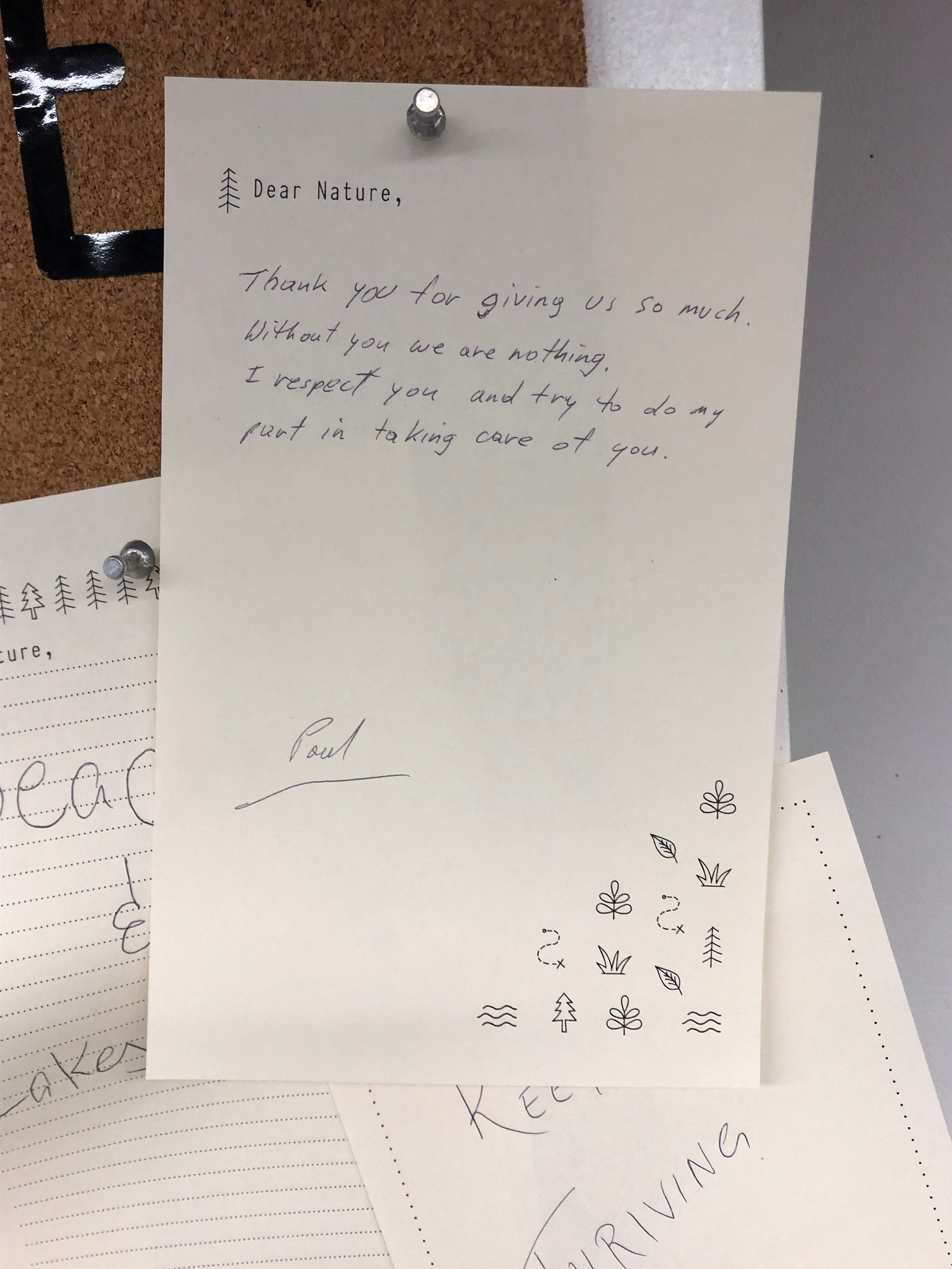 and to find new ones in your local neighbourhood. The exhibition included a letter writing prompt which asked viewers to write a love letter to nature after putting on headphones and emerging yourself in nature sounds. Once they are finished they were asked to pin the letters to the wall
